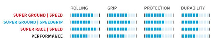 - Constructie en grip: Super Ground compound voor lage rolweerstand en snelle acceleratie